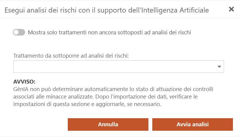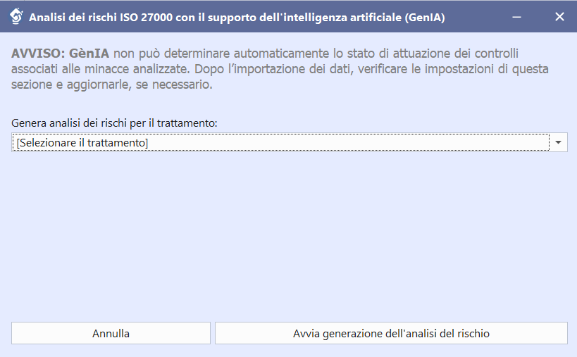 Seleziona il trattamento già presente nel progetto e lascia che GènIA ti supporti nella costruzione di una analisi dei rischi coerente con la logica della procedura ISO 27000, partendo dalle informazioni già censite e valorizzandole in modo strutturato.