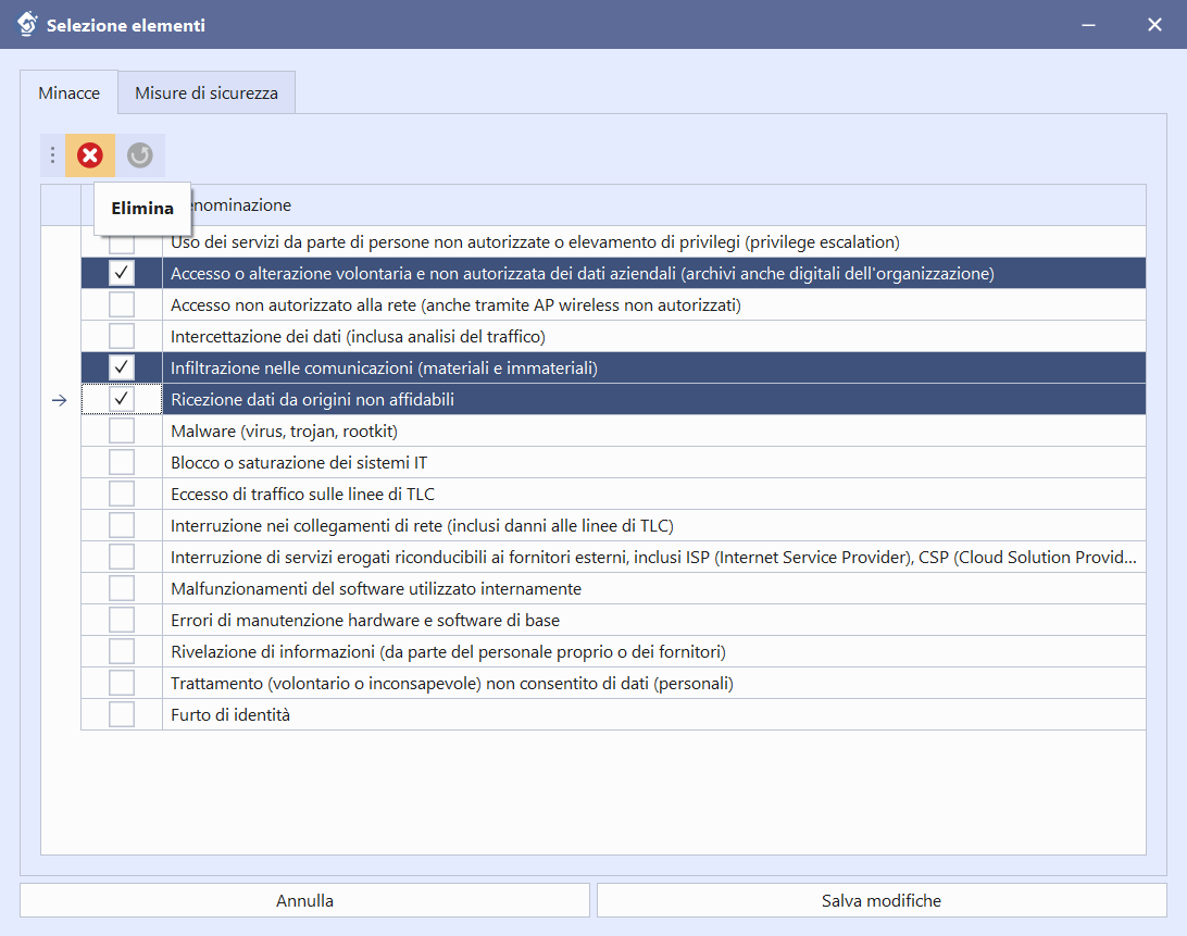 Poiché la funzione parte da un trattamento già censito, la lettura del rischio rimane ancorata alle informazioni reali del progetto: questo aiuta a ridurre incongruenze tra contesto operativo, minacce individuate e misure proposte.